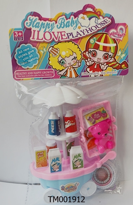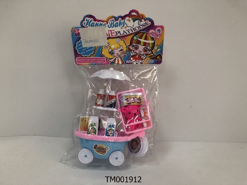 Only drink car with a hand basket. Teddy bear, food package
