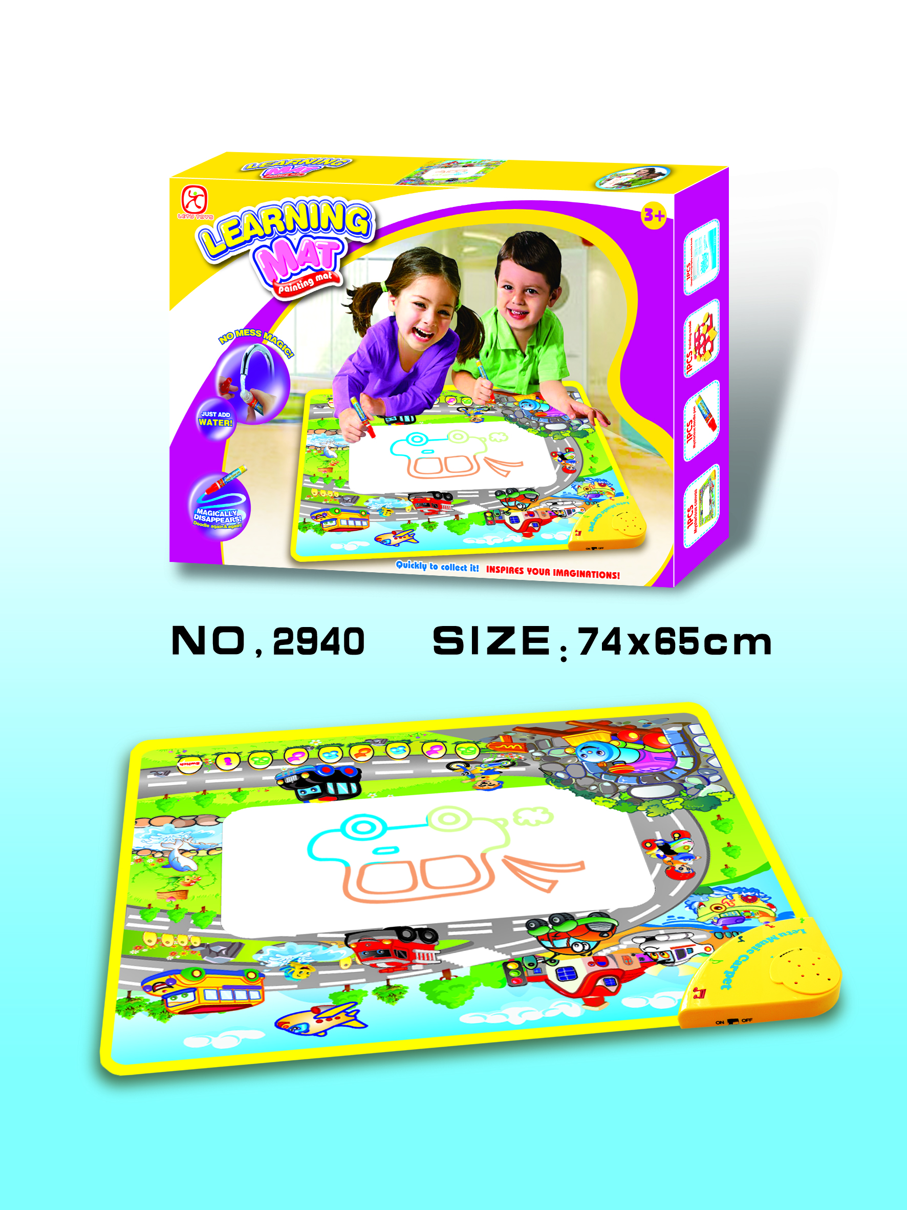 水画毯带灯光音乐,尺寸72*63cm,不包电(需3个AA电池)。含1水笔、1EVA工具、1说明书